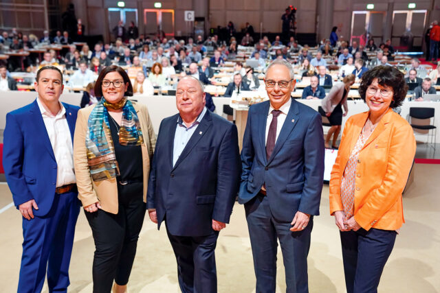 Die Mitglieder des gewählten geschäftsführenden Hauptvorstandes. (von links nach rechts): Francesco Grioli, Birgit Biermann, Ralf Sikorski (stellv. Vorsitzender), Michael Vassiliadis (Vorsitzender), Karin Erhard